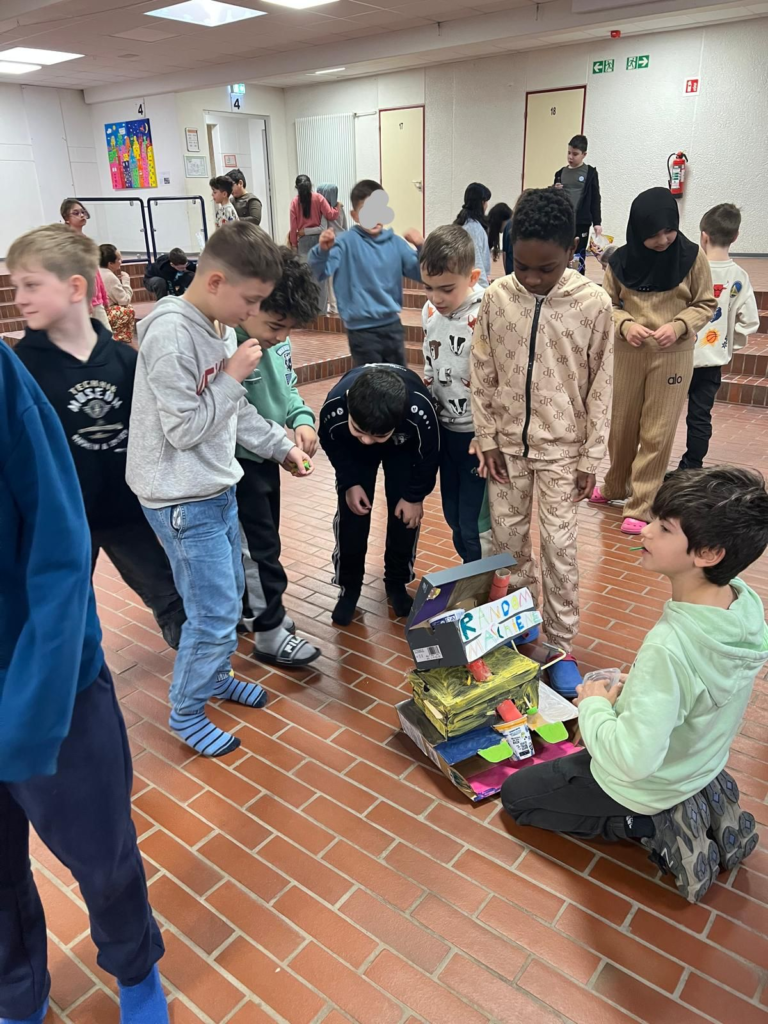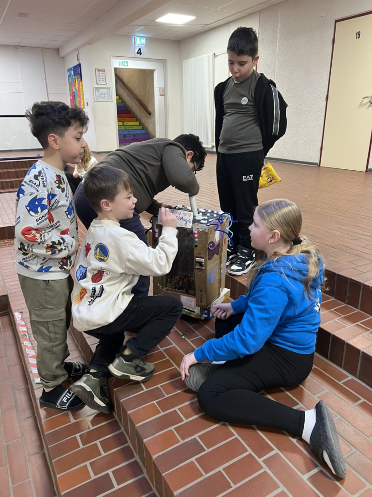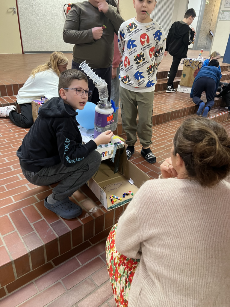 Am Dienstag, 3. März 2026 war es endlich soweit: Die Kinder der Klasse 4c präsentierten ihre kunstvollen Wunschmaschinen in einer Ausstellung in der Aula. Stolz bauten sie ihre Maschinen auf, erklärten den Besuchenden die Funktionen und erzählten von den Herausforderungen und Erfolgen während des Bauprozesses.